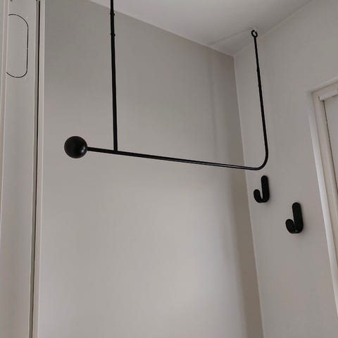 Tanskalaisen Gubin naulakko, Mathieu Matégotin 50-luvulla suunnittelema. Materiaali: jauhemaalattu metalli, messinki. Ollut seinässä, joten pientä käytönjälkeä nähtävissä, katso kuvat yksityiskohdista. Alkuperäiset mustat ruuvit tulevat mukana, lisäksi seinätulpat.