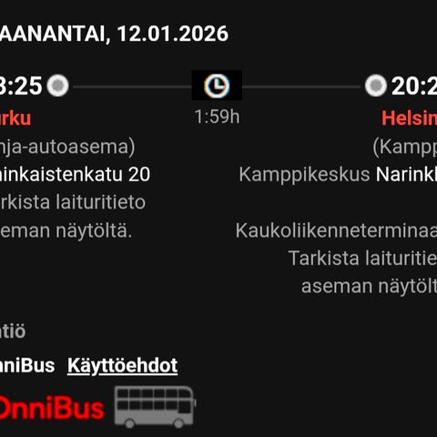 Myydään 1hlö bussilippu Turku-Helsinki 12.1. Lähtö Turusta klo 9.45. Ja perillä Kamppi 11.44. Toimitus sähköpostitse tms.