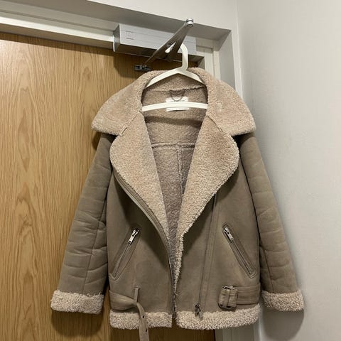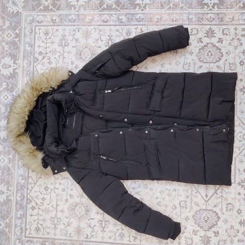 Tyköistuva, musta talvitakki. Käytetty muiden takkien ohella lähinnä lasketellessa. Lämmin karvahuppu. Ei kulumaa, eikä haalistumaa. Koko M/38, mutta erittäin pientä mallia, parempi S-kokoiselle (kuvan malli 165 cm pitkä).