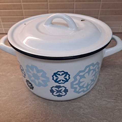 Hackmanin uusi, käyttämätön emalikattila, tilavuus 3,9 litraa, halkaisija 20 cm. Valkoinen kattila sinisillä lumihiutale-kuvioilla. Valmistettu raudasta, pinnoitettu emalilla. Sopii induktioliedelle ja muille liesityypeille, ei astianpesukoneeseen. Tarvittaessa voidaan lähettää, jolloin hintaan lisätään postikulut 11€.