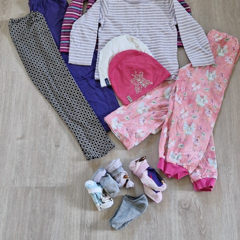Vaatepaketti, koot 116- 130 välissä. Meillä lapsi käyttänyt kun ollu koossa 116cm.