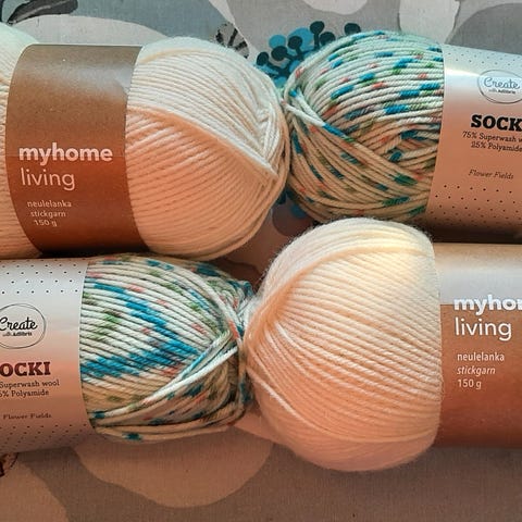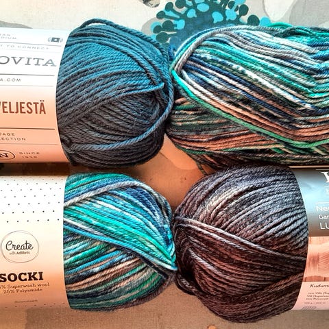 5 kerää valikoimista jo poistunutta Mountain Grey -väriä, jossa vuorottelevat valkoinen, tumma ja vaalea harmaa sekä vaalean ruskea. 75 % Superwash-villaa, 25 % polyamidia.