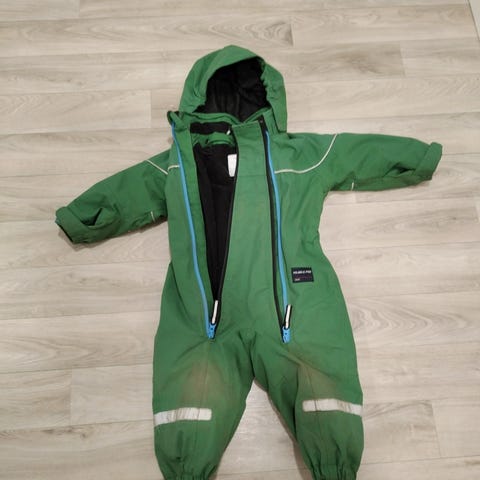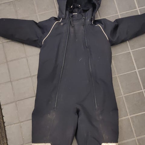 Tummansininen, vuoreton Popin välikausihaalari, jossa tuplavetskari. Käytetty kunto näkyy heijastinnauhoissa ja edessä haalea tahra, jota kuvassa sormi osoittaa. En ole tahranpoistoa siihen kokeillut ettei ominaisuudet kulu kun varsin huomaamaton tahra. Toinen repaleinen jalkalenksu paikoillaan, toisesta puuttuu, mutta napit lenksun kiinnittämiselle löytyy.