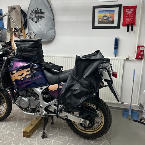 Laukkussa pikakiinnikkeet tankkiin kiinnitettävään alustaan. Alustassa yhtä remmiä jatkettu tarvikeremmillä (saa pois).