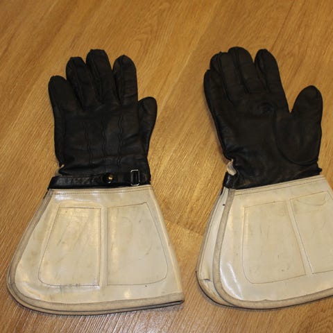 Aitoa nahkaa, moottorikelkkahanskat, joissa karvavuori. Väri musta, koko ei tiedossa, mutta miestenkoko n. M
