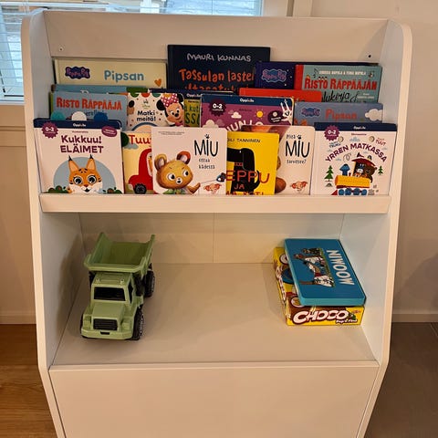 Hyllyssä useita tasoja ja alalaatikko säilytystilaa varten. Sopii lastenhuoneen järjestämiseen ja lelujen tai kirjojen säilytykseen.