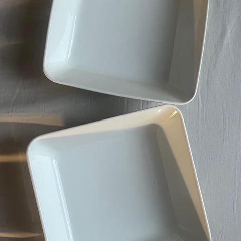 Iittala tarjoiluastiat eri väreissä. Isommat astiat kokoa 16 x 16 cm - värit valkoinen 2 kpl, helmenharmaa ja oranssinpunainen. Pienempi valkoinen kokoa 12 x 12 cm.
