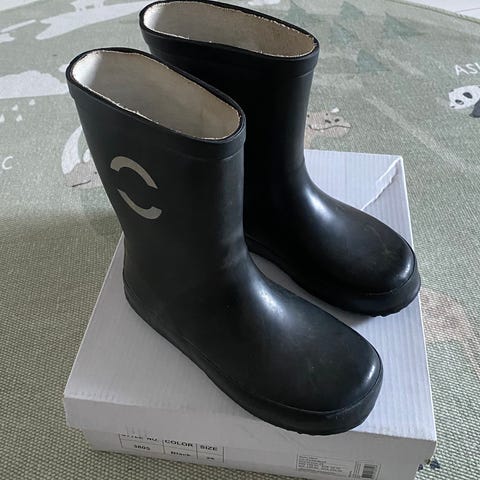 Käytön jälkeä on jonkin verran. Pientä kulumaa pohjassa, vuorikangas vähän repsotti ja se on liimattu tekstiililiimalla, tummentumaa pinnassa arasta väristä johtuen. Pohjallisesta ohut pintakangas irronnut ja sisäsyrjän tuki napattu pois. Ehjät ja käyttökelpoiset saappaat kuitenkin vielä.