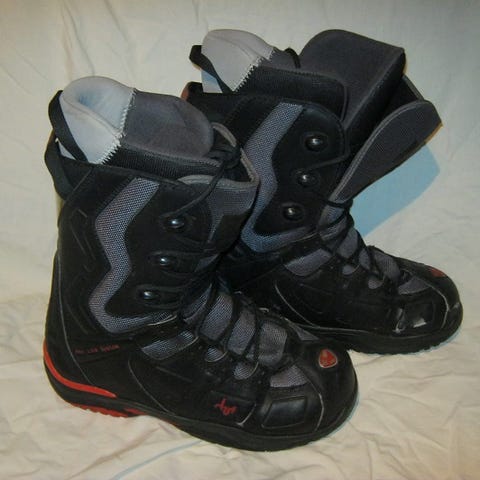 AirWalk merkkiset lumilautakengät. Kokomerkintä on 45 1/2 ja sisämitta on 29 cm. Ehjät kengät (toisen kengän kärjessä pieni läikkä spreimaalia), kaikki lenkit ja nauhat yms. kunnossa. Hyvät esim. lautailua aloittelevalle ja joka ei halua sijoittaa isoja summia uusiin kenkiin tai ruveta vuokrailemaan kenkiä. Hinta 40 e