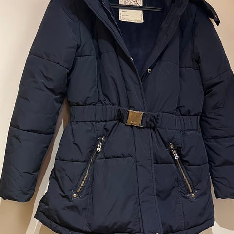 Sfera merkkinen tummansininen toppatakki jossa metallinhohtoisia kukkia. Käytetty yhden kerran lyhyesti kun olikin meille pieni. Koko 152cm-164cm mutta vastaa vähän pienempää.