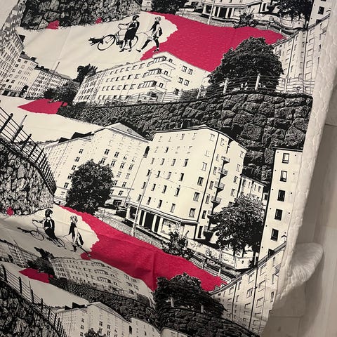 Myydään siistit Vallilan Pengerkatu kuosin sivuverhot, mustavalkopinkit.