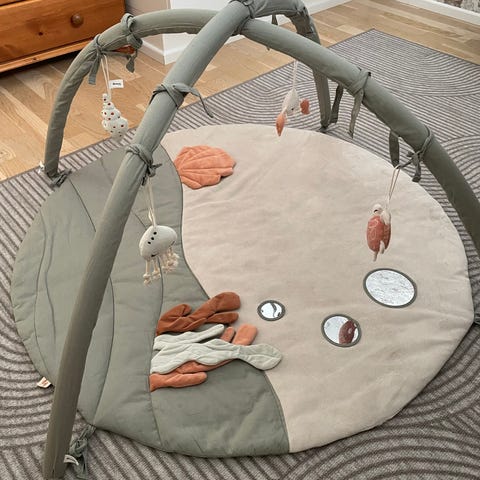 Kaarissa roikkuvat hahmot seepra, leijona ja karhu sekä kirja ja peili kannustavat lasta aktiivisuuteen ja kurottautumiseen, edesauttavat motoristen taitojen oppimista, vahvistavat lihaksia sekä tukevat näkö-, kuulo- ja tuntoaistin kehittymistä leikin avulla. Materiaalien erilaiset tekstuurit, kontrastivärit ja pehmeät äänet ovat loistavaa viihdettä vauvan kehittyville aisteille elämän ensimmäisistä hetkistä lähtien.