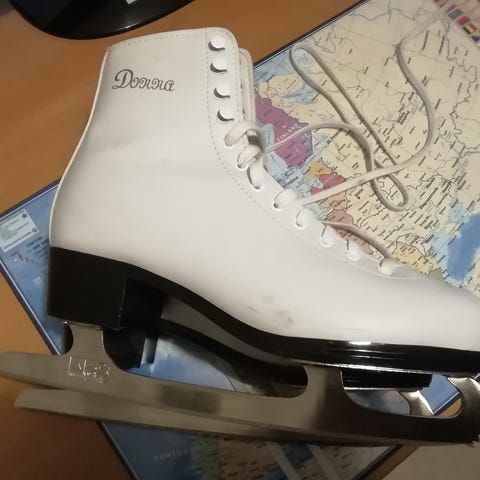 Nina luistimet koko 41, valkoinen väri. Pientä ruostetta toisessa terässä, näkyy kuvassa. Ollut pitkään kaapissa, kuitenkin tosi hyvässä kunnossa ja uskon, että pärjää alkuun ilman teroitustakin. Toki teroitus kannattaa aina.