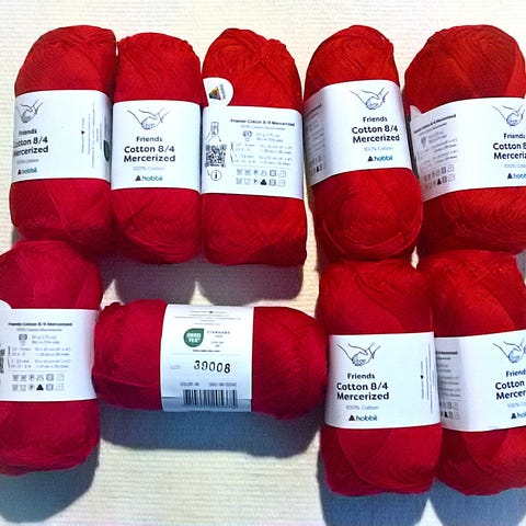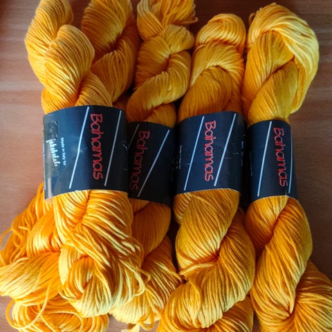 Lanka on mielestäni puuvillaa. Lanka on luultavasti purkulankaa tai vain keritty kerälle. Väreinä on valkoinen ja ruskeansävyt. Kerä painaa 120 g.