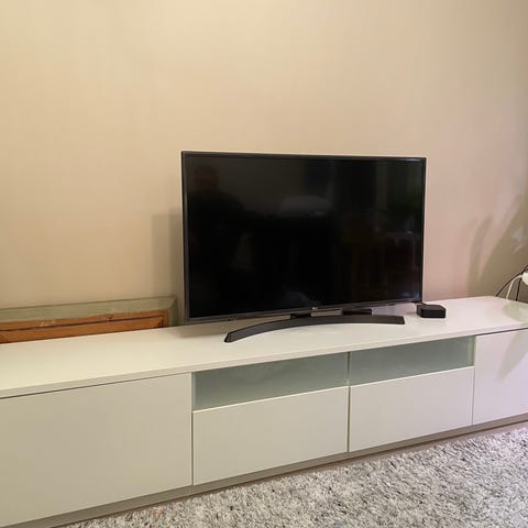 Tiikkiviilu TV - taso. 2 kaappia, 2 tasoa ja yksi veto laatikko.Runsaasti säilytys tilaa.Haku Palokasta.