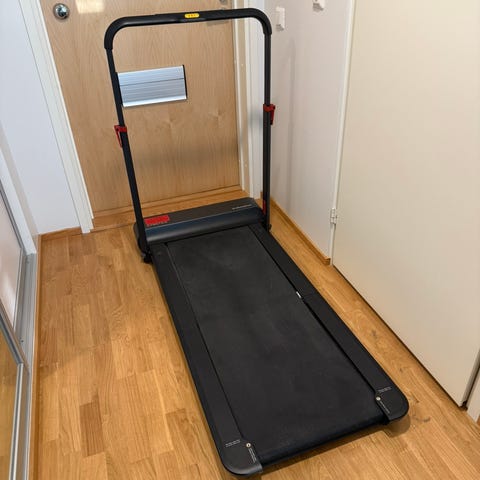 Trekkrunner TR-2000 kävelytietokone, jossa digitaalinen näyttö ja punainen kävelyalusta mustalla rungolla. Mukana virtajohto ja kaukosäädin. Käytetään kävelyharjoitteluun, tarjoaa tietoa kävelyn kestosta ja etäisyydestä.