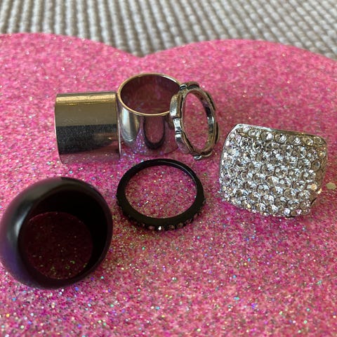 Hopeanvärinen terässormus. Muutamia strasseja puuttuu. Koko: 17. Hinta: 0,50 euroa.