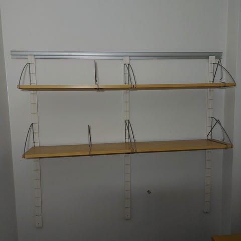Ehjä,siisti ja pientä käytön jälkeä. Tasoja on kolme ja koostuu kuudesta levystä joiden mitat ovat syvyys n. 30 cm pituus n. 80 cm ja leveys n. 2,2 cm. Valkoisia metallisia kiinnitys kiskoja on kolme ja toisessa päässä on kaksi koukkua joilla kiinnitys ylä listaan. Valkoiset kiinnitys kiskot pituus n. 145 cm ja leveys n.5,3 cm. Sitten harmaa ylätaso pituus n. 180 cm la leveys n. 5,8 cm. Peitelista joka on kuvassa ylätason kanssa ja myös sen päällä toisessa kuvassa. Pituus n. 180 cm ja leveys n 3 cm. Lisäksi 12 kpl päätyihin ja levyjen väliin kiinnitys osat ja 6 kpl erilaisia väli osia sekä 6 kiinnitys ruuvia vaatii myös roppuruuvit niitä ei ole. Vain nouto ja maksutapa mielellään käteinen ja tasaraha tai tilille. Minulla ei ole mopilepäitä.