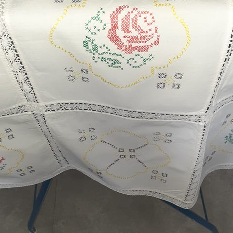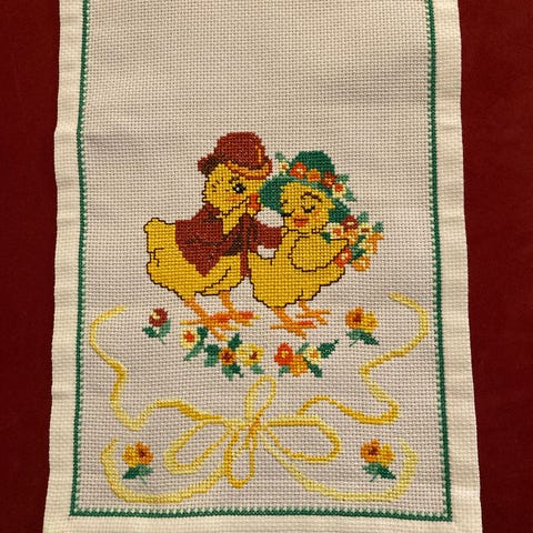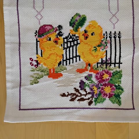 Valkoinen liina johon kirjottu pääsiäisaiheisia kuvia; tipuja, munia. Nouto tai postitus.