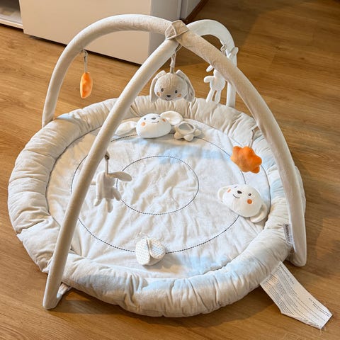 Erinomaisessa kunnossa oleva babysteps-merkkinen leikkimatto. Mukana 4 lelua, jotka kilisee, vinkuu, rapisee ja peilailee. Moitteina vain pari tahraa, joista erilliset kuvat. Pesty käsin hajusteettomalla pesuaineella.