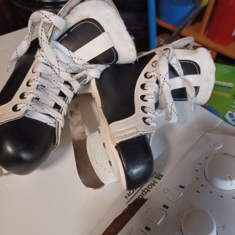 JHL 5000 luistimet, koko 33. Luistimet ovat mustavalkoiset ja suunniteltu jääkiekon harrastamiseen. Soveltuvat lapsille, joissa koko 33. Kuluma oikeassa luistimesta edessä, kosmeettinen haitta. Näkyy kuvassa