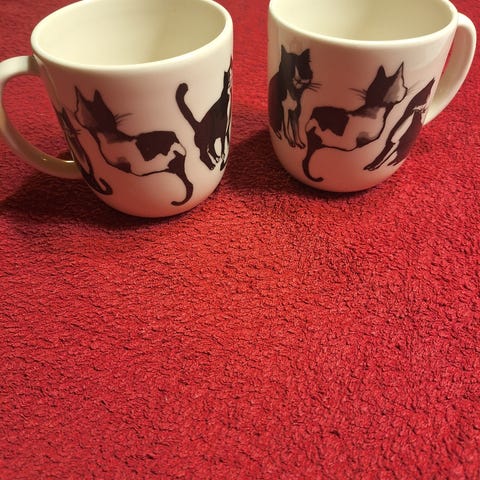 Pari keraamisia mukeja, joissa on käsinmaalattuja kissoja ja kaloja. Ostettu Portugalista, hyvä käytetty kunto. Koko noin 4-4,5 dl, täydellinen kahville tai teelle.