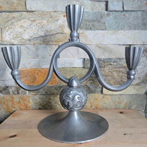 Myydään kaunis ja hyvin säilynyt, suomalainen tinasta valmistettu kolmihaarainen kynttilänjalka.