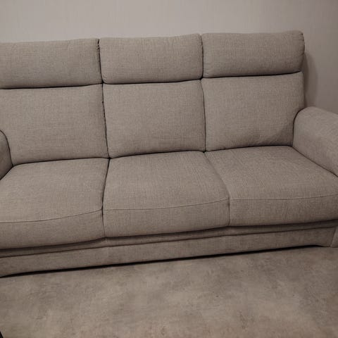 Harmaa sohva, noin 5 vuotta vanha. Merkki ei tiedossa mutta kuitenkin kotimainen, ostettu Kaluste Heinosesta. Kangas pellava sekoitetta
