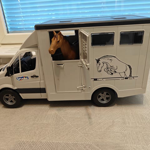 Hyväkuntoinen Bruder hevosauto. Mukana hevonen, aitaus ja tarvikkeet. Alkuperäinen takaluukun vetokahva on joskus katkennut, mutta korjattu ja tästä kuva.