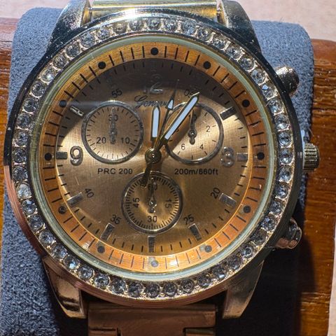 Miesten patteritoiminen rannekello Geneva merkki. Runko messingin värinen ja kellotaulu musta. Pieni viisari alapuolella vain koriste, kyseessä toiminnaltaan ihan perus rannekello ilman sen kummempaa monimutkaisuutta. Rannekkeessa lyhennyspaloja jäljellä, eli säätövaraa on.