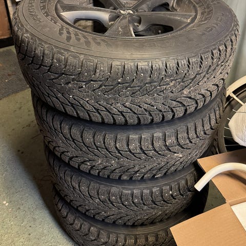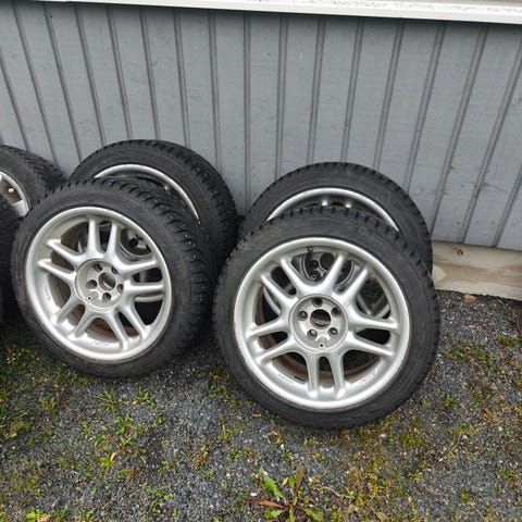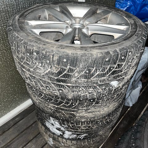 Kohtuu siistit vanteet 6x17 ja Nankang SW-8 nastarenkaat 205/50r17 8,6mm pinnalla, eli vähän ajetut. Dot 22. Yksi vanne ei ihan täydellinen, sisäreuna vipattaa vähän. Myös erikseen