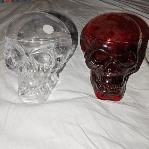 Muovinen pääkallo, korkeus noin 14cm, leveys noin 14cm, syvyys noin 18 cm.