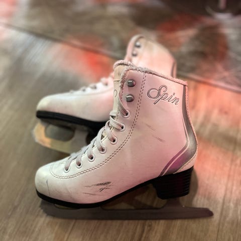 Spin valkoiset luistimet, koko 33. Siistit, vasemman luistimen kärjessä vähän kulumaa.