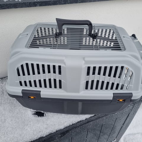 Koko 89x51x60cm. Materiaalina kestävä muovi ja metalliverkko lukolla. Päällä kanto-/vetokahvat. Soveltuu koirien kuljetukseen ja tarjoaa turvallisen tilan matkustamiseen. Todella hyvä malli auton takakonttiin. Sopii max. noin 25kg koiralle.