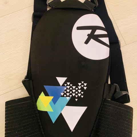 Erittäin hyväkuntoinen iskusta aktivoutuva selkäsuoja. Tarrat, henkselit ja kankaat ehjät ja siistikuntoiset. Pituus 43cm. Koko M, käy lapselle, jonka selän mitta 40-44cm (kts. Kuva)