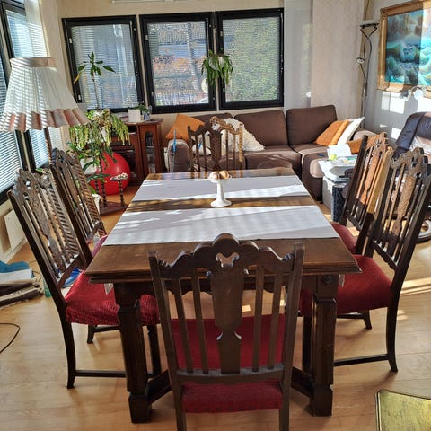 Pirttipöytä ja kuusi tuolia 1930-luvulta.