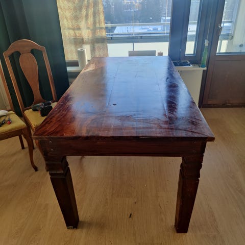 Pöydän pinnassa on värjäymiä, jotka ei lähde pois. Pinnan voi toki vaikka maalata. Muutoin ihan ok-kunnossa!