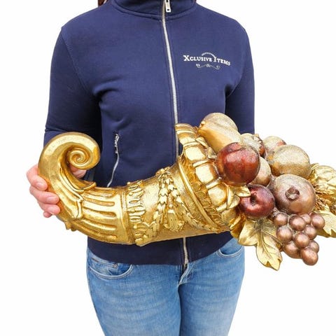Tämä koristeellinen cornucopia sisältää rikkaat yksityiskohdat metallisistä hedelmä- ja lehtikuvioista, luoden vaikuttavan ja ylellisen ilmeen. Se symboloi runsautta ja vaurautta, ja lisää klassista eleganssia mihin tahansa sisätilaan. Täydellinen koristeellinen yksityiskohta konsolille, kaapille tai näyttöpöydälle.