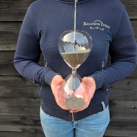Tämä tyylikäs lasinen kellohiekka harmaalla hiekalla on todellinen katseenvangitsija missä tahansa sisustuksessa. 23 cm korkeana se yhdistää toiminnallisuuden ja modernin yksinkertaisuuden. Täydellinen koristeeksi, ajannäyttäjäksi tai ainutlaatuiseksi lahjaksi. Lisää rauhaa ja muotoilua tilaanne.