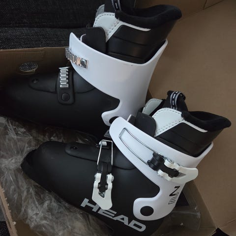 Head Z2 Lasten laskettelumonot musta ja valkoinen väri. Koko 22.5. Varustettu kahdella soljella ja pehmeällä vuorella. Käyttämättömät.