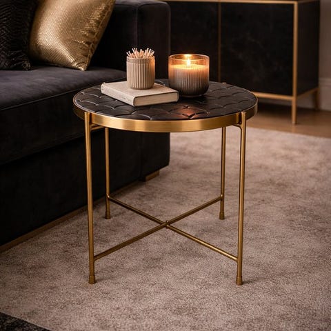 Tämä uusi tyylikäs sivupöytä on valmistettu metallista ja siinä on erottuva pöytätaso, joka on päällystetty mustilla koristeellisilla laatoilla. Sen hienostunut kultainen kehys lisää ripauksen ylellisyyttä, tehden siitä tyylikkään lisän moderniin ja klassiseen sisustukseen. Täydellinen sivu- tai koristepöytä sohvan tai nojatuolin vieressä. Kompakti mutta silmää miellyttävä muotoilu, joka yhdistää toiminnallisuuden ja hienostuneisuuden.