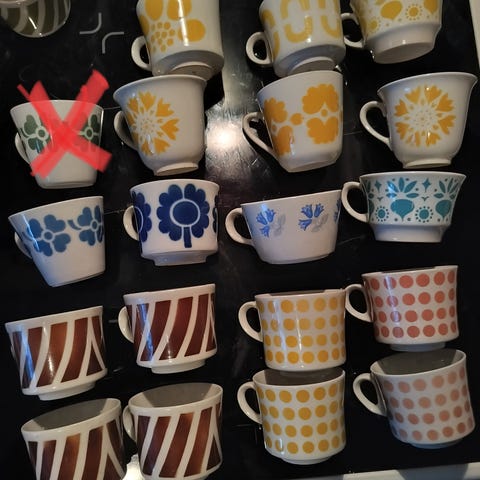 Hilkka Liisa-Ahola käsinmaalattu teekuppi. Kupin reunassa lasitteen alla kuoppa reunassa joka tehtaalla jo valmistuksessa ollut ennen lasitusta. Lasite siis päällä. Lautanen jossa alapuolella kolhu jossa korjaus. Hieno kuppi kuitenkin käyttöön.