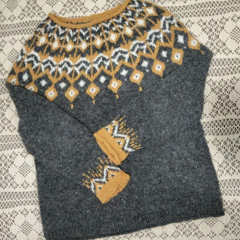 Luonnonvalkoinen kaarrokeneule, uutta vastaava kunto. Itse tehty Novita 7 veljestä Nummi -langasta (76% villa 20% polyamidi 4% viskoosi).
