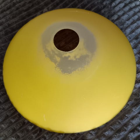 Annetaan Ståks armaturin kattovalaisimen lasikupu. Lampussa olevat muoviosat huonokuntoiset, mutta itse kupu vielä ehjä ja toimiva, pari naarmua kuvusta löytyy. Halkaisija on 42,5cm.