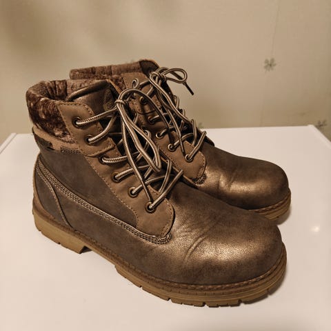 Valkoiset "jäljet" kengässä on heijastumaa lampusta, ei ole kengässä.