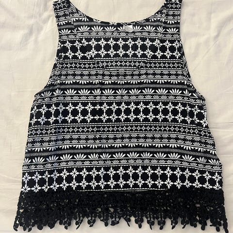 Musta, jonkun verran pidetty toppi. Kuitenkin vielä siisti ja käyttöä kaipaava.
