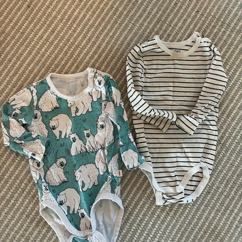 Set of warm clothes: two onesies size 62, wool overall pants approx 50-56, two hats, two pairs of wool socks (one newborn size, one larger pair).