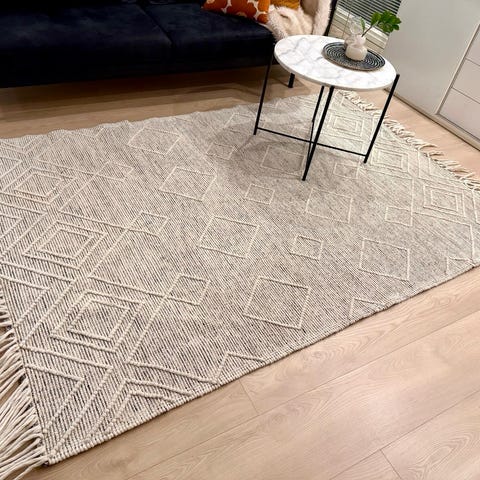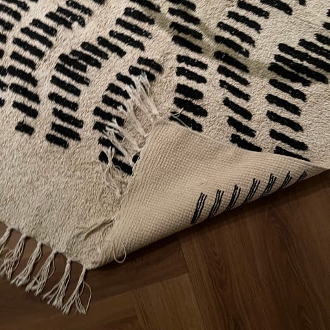 Joutilas trendimatto myyntiin. Ehyt, mutta jokunen tahra löytyy (ks. kuvat). Voi pestä kotikonstein, kun kevyehkö puuvillamatto.