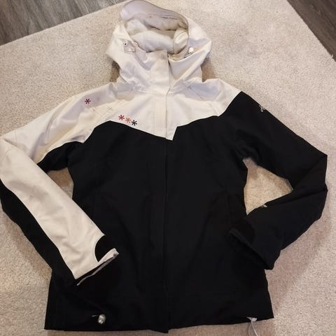 Ehjä ja siisti, joitakin langannousuja takin sisäpuolella (ks. viimeinen kuva). Jotain pientä tahraa huomasin (hihansuussa ja edessä). Takkia ei ole pesty kertaakaan. Takkia on käytetty joitakin kertoja lasketellessa. Viimeiset vuodet ollut kaapissa säilössä.