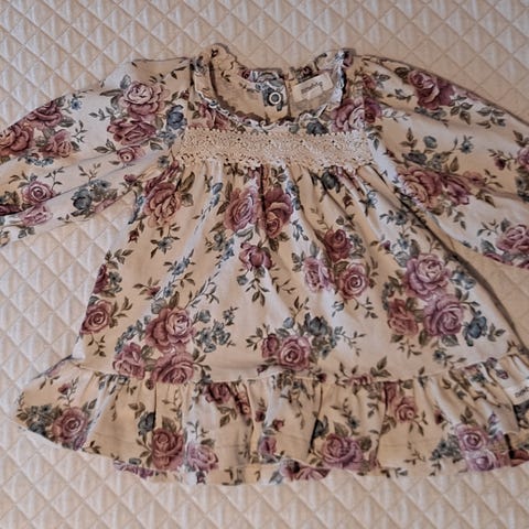 Hyväkuntoinen Newbien mekko, kokomerkintä 62 cm. Pohjaväri valkoinen. Pientä pesuhaitua pinnassa. Taloudessa ei lemmikkejä. Hajusteeton pyykinpesuaine käytössä.